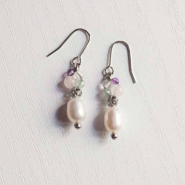 淡水パールと春色天然石のピアス Y-1375P