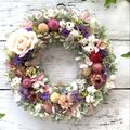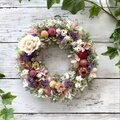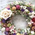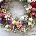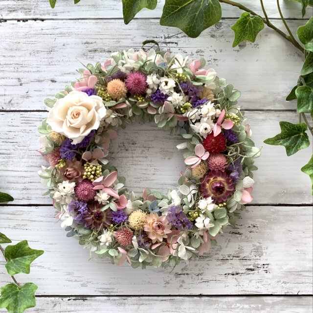 プリザーブドフラワーのホワイトローズとドライフラワーの千日紅・スターチス・帝王貝細工などをギュッと組み合わせたリースです。