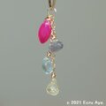 一番上は、宝石室フューシャピンクカルセドニーAAA、その下は宝石質アイオライトAAA、その下は宝石質スカイブルートパーズAAA、一番下に宝石質レモンクォーツAAAのドロップブリオレットカットを下げました。
