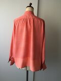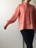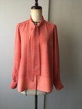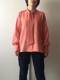 コーラルオレンジの江戸小紋をボウタイブラウスにリメイクしました。顔を明るく見せてくれるキレイ色。遠目には無地に近い非常に細かい柄なので、スーツやジャケットのインナーにもぴったり。裾だけオレンジのグラデーションになっています。