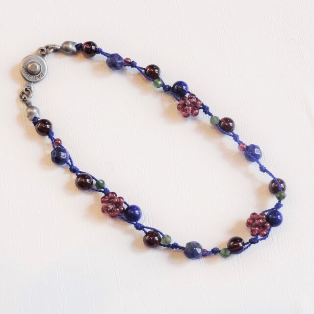 使用パーツ:ガーネット ラピスラズリ ソーダライト モスアゲート ドイツ製シルクコード(ネイビー) メッキ金具(アンティークシルバー色)