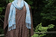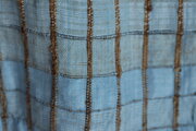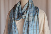 野蚕糸の一種タッサーシルクの太糸と水色細い絹糸を組み合わせたの格子柄のマフラーです。