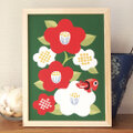ほっこり可愛らしい和風の椿と赤べこのイラスト