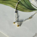 2種類のレインボームーンストーンの美しさ、間に挟み込まれた金色のヴェルメイユ、キラキラと繊細に輝くシルバーの蝋引き糸、そこに編み込まれた小さなパール、どれもとても素敵です。 軽くて着け心地が良いし、長さ調節もできるし、留め具が外れて落とす心配もない。季節を問わず愛用してしまいそうです。 素敵な作品をありがとうございます!