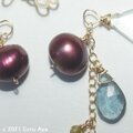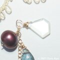 チェーンに下げて、秋映のようなイメージの淡水パールを下げ、その下に宝石室モスアクアマリンAAAのペアシェイプブリオレットカットを下げました。