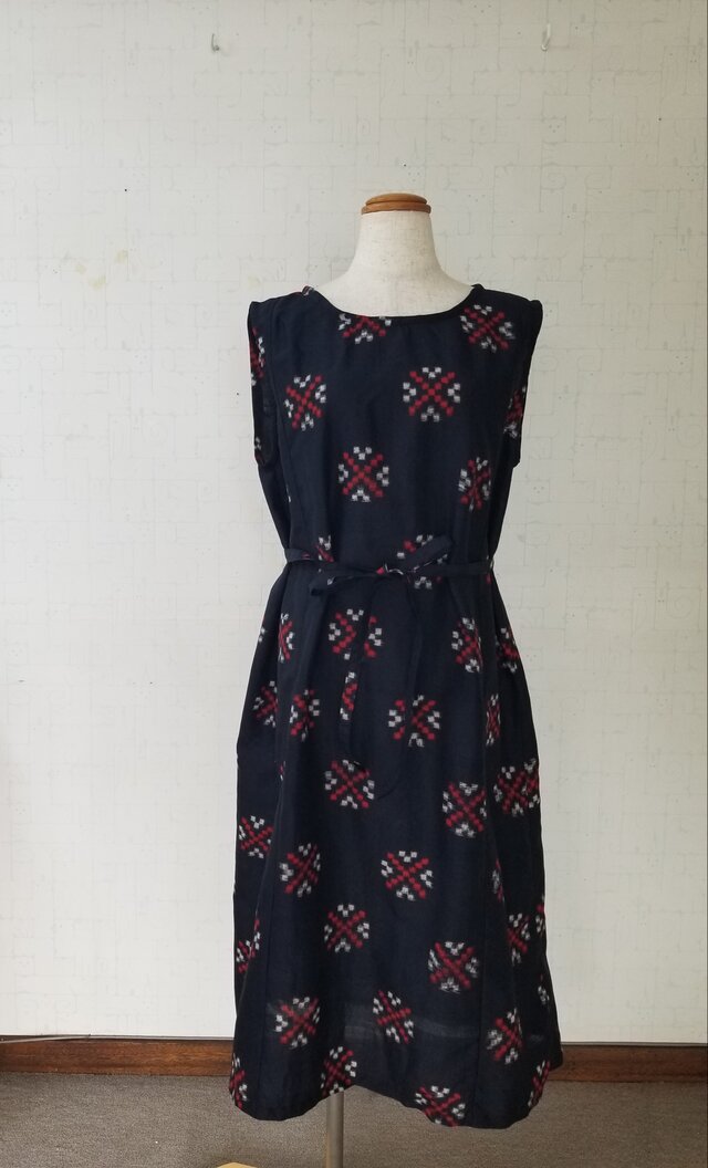 大正ロマン絣模様織り出し銘仙着物から、紐付きのワンピースを作りました。