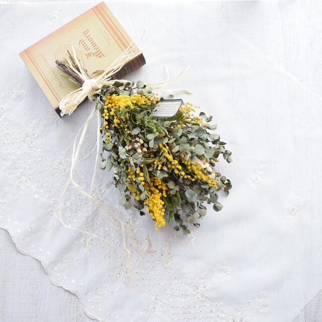 使花材:ミモザ、グニーユーカリ、小判草
