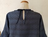 後ろ襟ぐり中央に涙開きがあり、襟ぐりバイアスから延長された紐を、結んで着ていただくようになります。