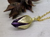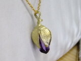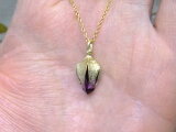 沙羅樹(シャラノキ)夏椿の実が種を落とした殻を銀に置換鋳造しました*茎を丸めたバチカンに、鋭い先端は丸く仕上げました*咲き誇った夏、実を付けた秋、種を落とした冬。。過ぎた日々を思いしのぶような『沙羅の追憶』です*役目を終えた可愛い殻にはメキシコ産ベラクルスアメシストを抱いてもらいました*レアアメシストのひとつベラクルス、濃色で極めて透明度が高いポイントが煌めきます*夏椿は平家物語の冒頭二節目にも記されている仏教聖樹の沙羅双樹(さらそうじゅ)に似ていることから沙羅樹(シャラノキ)ともいわれており、この殻もどこかオリエンタルな雰囲気も感じます*トップは925にアンティーク調K18gpを施しました*14kgfチェーン太さ1.3㎜長さ50㎝付き(長さのご要望も承ります)14kgfは真鍮を芯に14金の被覆が施され比較的アレルギーリスクが低く気軽にゴールドの輝きを楽しめるとして人気の素材となっております*