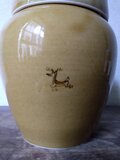 薄茶色の釉薬を掛けた蓋付きの壺です。磁器なので丈夫です。正面に入れた鹿の絵が良いアクセントになっています。