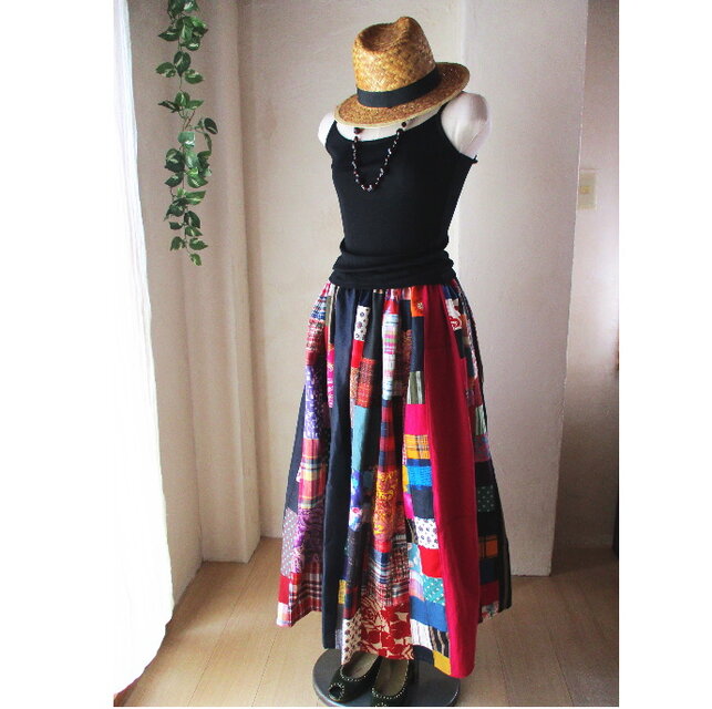 深い赤色系ギャザーマキシとっても素敵。赤系マルチカラーティアードマキシと見比べどっちもも可愛い~可愛い~と連呼、うっとりしています。お作りがとても丁寧で美しく、パーツ生地の並びも最も濃い色(黒地に花柄等)が良い間隔で分散配置されていて素晴らしい。平太ゴムの具合もちょうど良い自然な乗っかり感。年配者なのですがおすすめの作品です。迷われている方はぜひご注文を、と思います。 ありがとうございました!