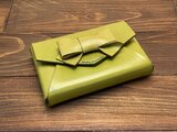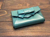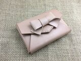 本革製の一枚の革から組み立てて作っている小さいリボン付きの箱型のカードケースです。