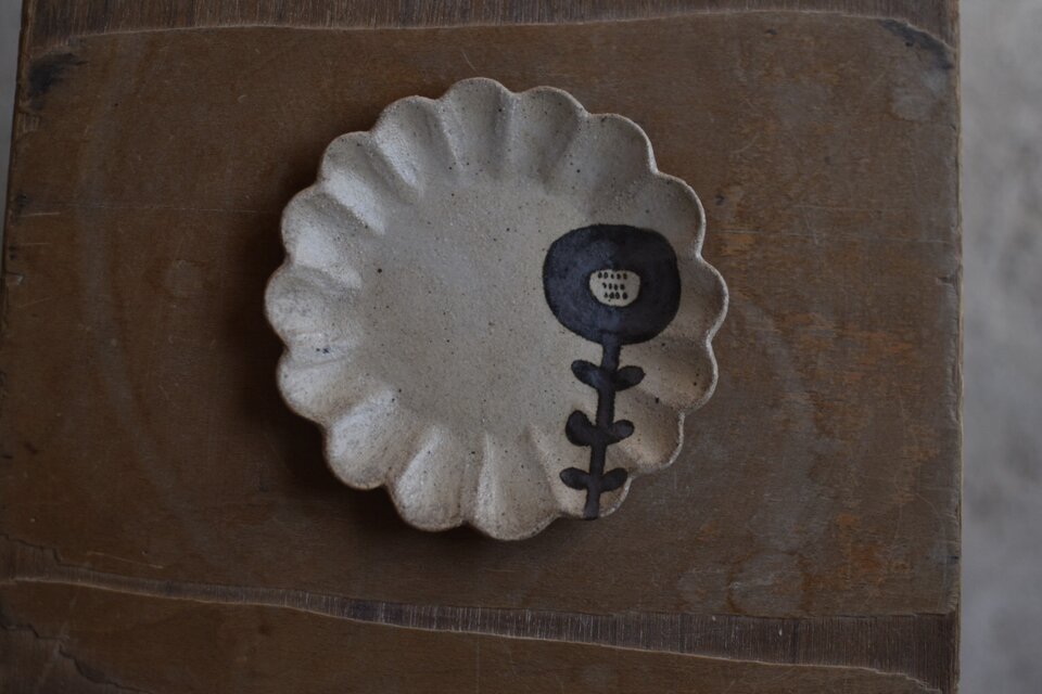 鉄(ベンガラ)で絵付けをした花型の小皿です。