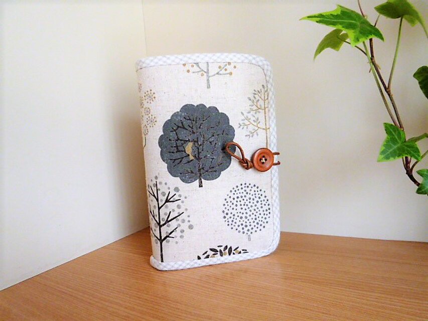表布はコットンリネンキャンバス、内布はコットン生地です。いずれもしっかりした丈夫な素材なので、日常使いにピッタリです。縁はコットンリネンの生地で作ったバイアステープで始末することで、引き締まった雰囲気に仕上がりました。