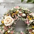 プリザーブドのバラとドライフラワーのミモザを組み合わせたグレイッシュカラーのリースです。