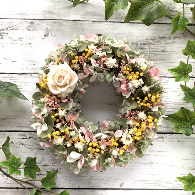 【2021春の新作】バラととミモザのグレイッシュリース◇ ♯春リース ♯ミモザ ♯母の日