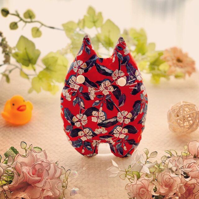 リバティー生地☆赤の花柄の猫のぬいぐるみ「ふにゃ〜た」