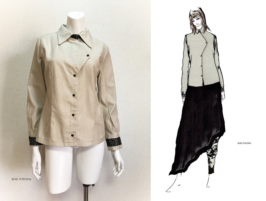 素敵なブラウスが届きました。首元の黒いトリミングがとても効いていると思います。デザイン画のように黒いロングスカートと合わせて、足元はパンプスで気合を入れて。動きやすいのもいいですね。ありがとうございました。