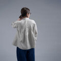 ゆったりとした身頃です。着丈はお尻の真ん中くらい、袖丈はちょうど手首です。襟が首にピッタリとしていないので、ストレスがないです。ピンタックが美しく、眩しいです!