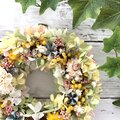 ソーラーシフォンカーネーションとドライのミモザを組み合わせた柔らかな色合いのリースです。