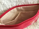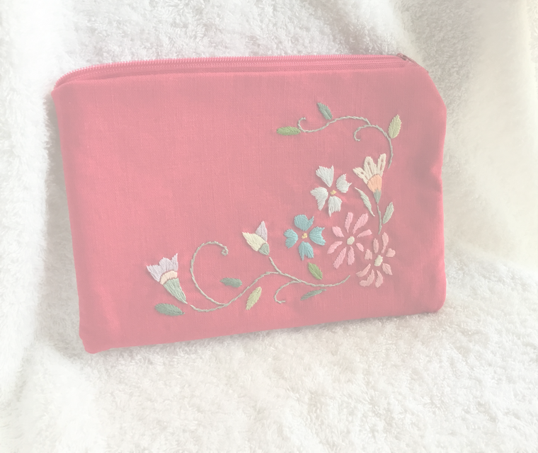 チェリーピンクの刺繍用布地に刺繍を施したフラットポーチです。