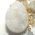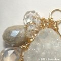上からクリスタルのロンデルを2個、コーティングシリマナイトのドロップブリオレットカット、セレモニアムーンストーンのペアシェイプ、一番下にはスカイブルートパーズのペアシェイプを下げました。