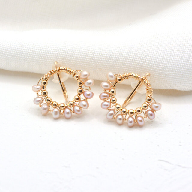 ミニフープに小粒淡水パールをレースのように編みつけて、フェミニンな印象を与えてくれるイヤリングです。