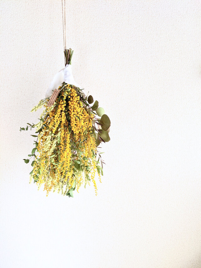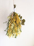 自家製ミモザとユーカリポポラス、スターチスなどを組み合わせた素朴でシンプルなドライフラワー・スワッグです。