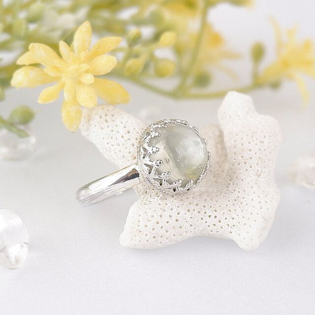 透明感のある淡いグリーンのムーンストーンをレースのようなデザインの枠でリングに仕上げました。