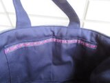 中の生地は木綿の紺色で、ポケットはスマホなどが入る細長いのと中に仕切りを付けた横長のものを二か所付けております。