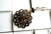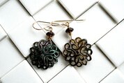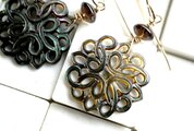 直径2.2cm程度の美しい透かし模様のシェルを下げたピアスです。 黒蝶貝といっても、茶とベージュのバイカラーになっていて、左右で表情が少し違っています。