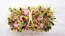 花材:ミモザ、バラ、ヘリクリサム、アジサイ、ボアプランツ、デュモサ他…