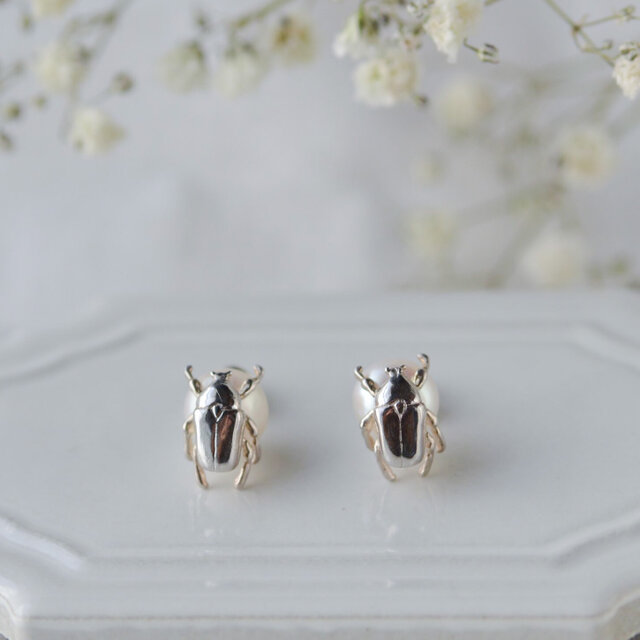 シルバーで作った「ハナムグリ」という昆虫と、淡水パールと合わせた個性的なピアスです。