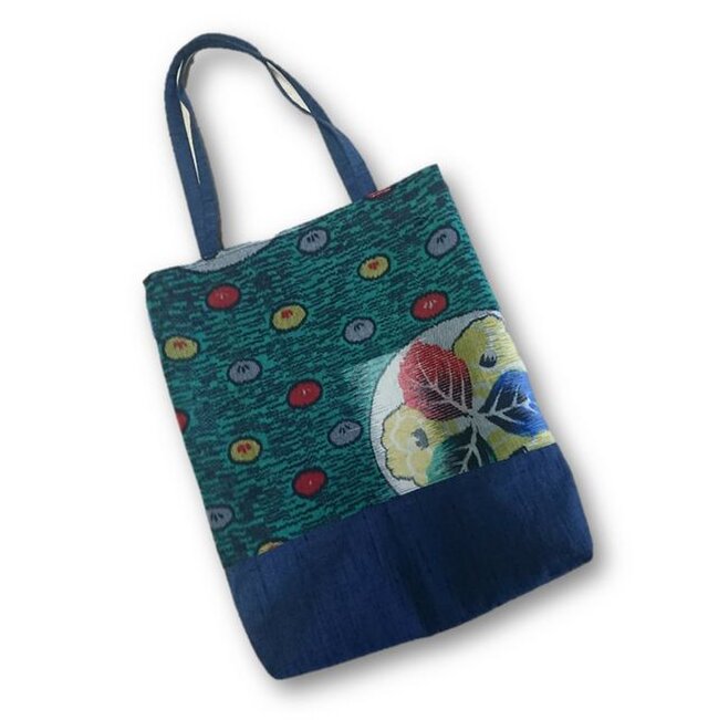 68 銘仙×紬リメイク縦長トートバッグ(グリーン)