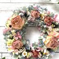 淡いピンクのアンティークローズをメインにドライフラワーの帝王貝細工やアンモビュームを合わせたシックな大人可愛いリースです。