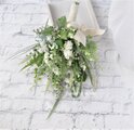 素材:アーティフィシャルフラワ-(造花):ユーカリ・キャットテイル(グリーン)・スターチス・グリーンの実・アスパラガス・ホワイトフラワー・アスパラガス、など。