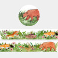 リス、きつね、クマの森の動物たちが草原を歩くループデザインです。