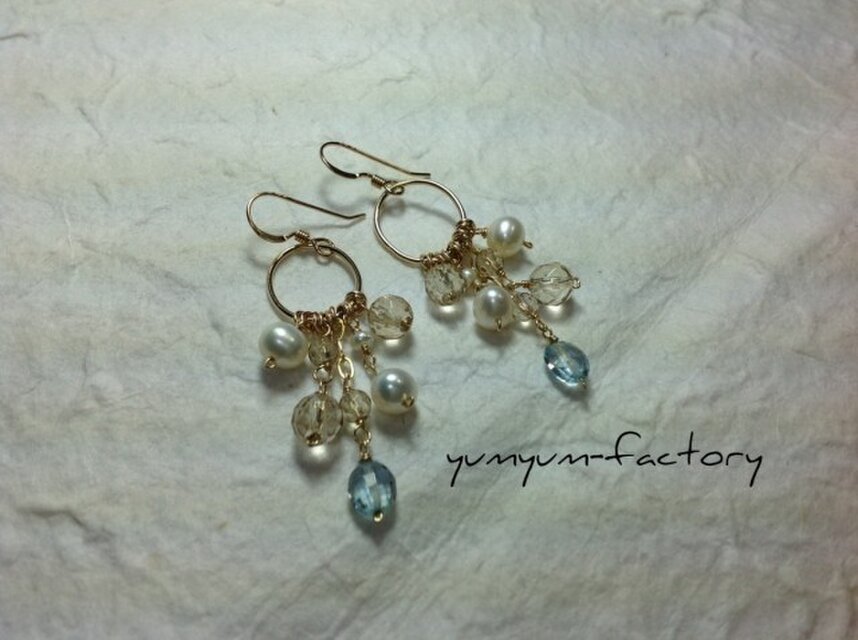 ブルートパーズ・淡水パール・シャンパンカラークォーツを使ってじゃらじゃら感のあるピアスを作ってみました。