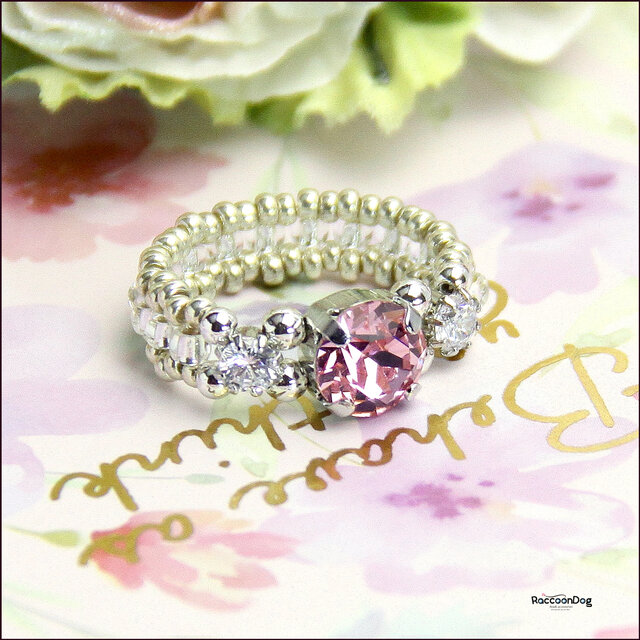 ビーズ,リング,コスチュームジュエリー,ビーズアクセサリー,ビーズリング,ビーズ指輪,ジルコニア,スワロフスキー,ライトローズ