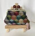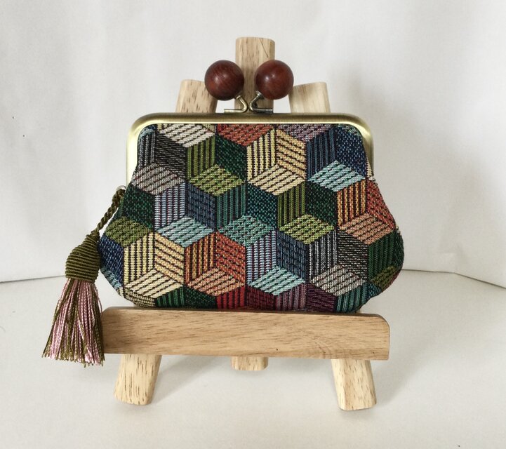 スペインからの輸入生地、キューブ柄で作りました木玉親子がま口ミニ財布です