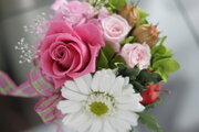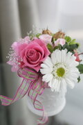 白いガーベラをメインにピンクのローズやリンゴを入れたアレンジ。