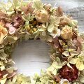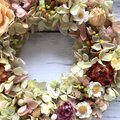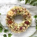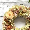 プリザーブドの淡いオレンジのバラとドライフラワーのフーセンポピーや帝王貝細工などをオレンジカラーに仕上げたリースです。