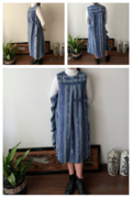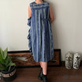 サイドフリルとサイドリボンとハイウエストの贅沢手織り綿ワンピース 青絣