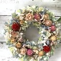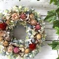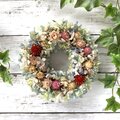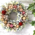 ドライフラワーの千日紅や帝王貝細工・オレガノケントビューティーなどを使った可愛らしいリースです。