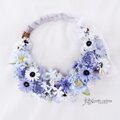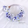 直径25cmのひげヅルリース台に色々なブルーの花と白いデージーをつけました