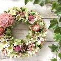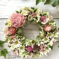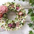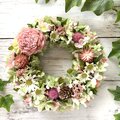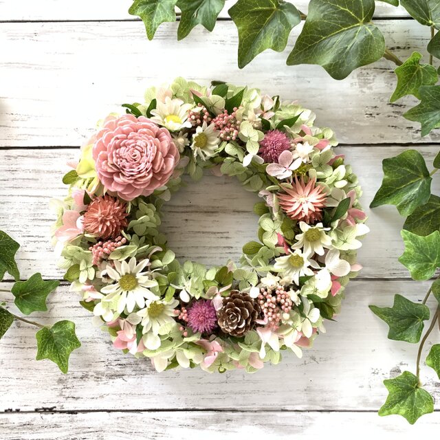 優しいピンクのソーラーローズが目を惹く上品なイメージのリースです。