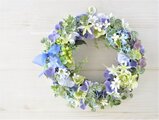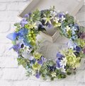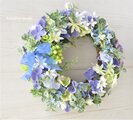 紫陽花に緑のスグリの実をそえて リース:紫陽花 むささき 青 グリーン 白