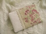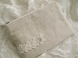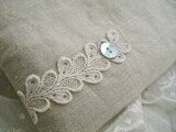 背面はナチュラルリネンに羽根のようなデザインが珍しいアンティークモチーフレースをアップリケして