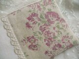 くすんだパープルとグリーンで優しい雰囲気のバラがプリントされたリネンを