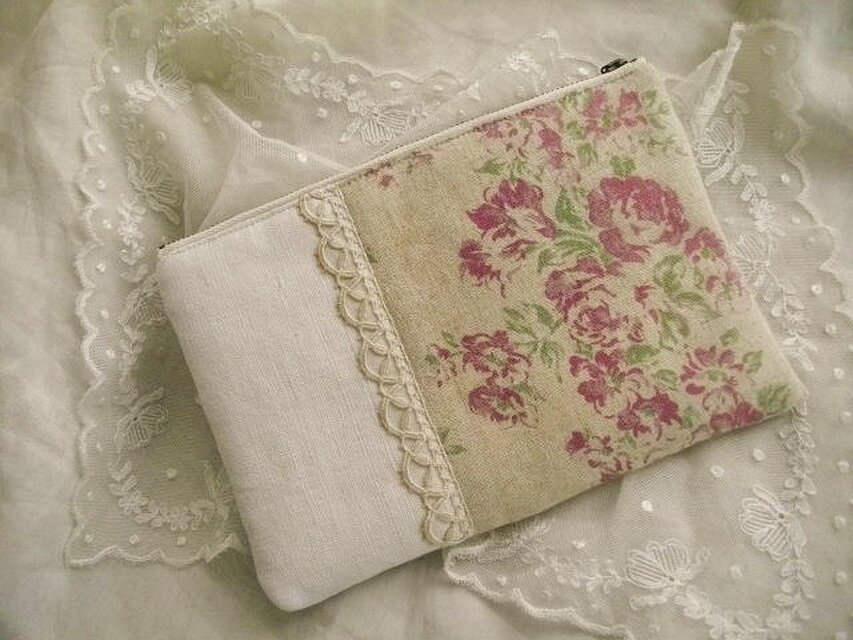 アンティークホームスパン(手織り)リネンと組み合わせたファスナーポーチです